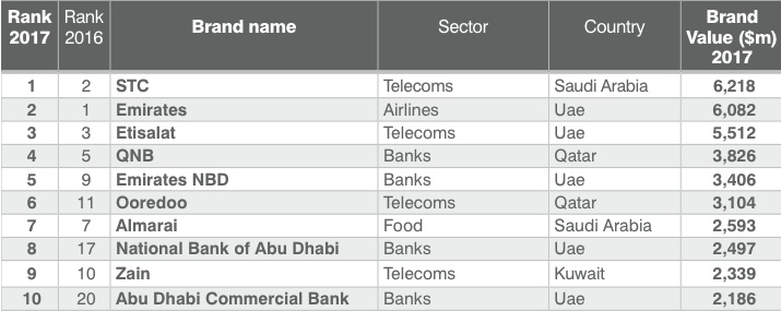 Emirates has been the most valuable brand in the Middle East ever since Brand Finance initiated its ranking in 2010 and the Dubai-based airline has been top of its industry at a global level for the last five years. However, 2017 sees a surprising shift. Emirates’ brand value is down 21% to US$6.1 billion. This sees it lose its place at the top of its industry; three US brands (American, United and Delta) have overtaken it. Even more surprisingly however, Emirates has lost its place as the Middle East’s most valuable brand to STC.